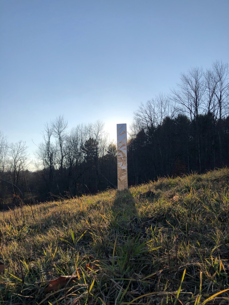 Yes, I admit it. I’m the man who put the shinny Obelisk in a Vermont stream. I conjured it in ten minutes, out of a spruce two-by-six, some tinfoil, a little duct tape and a ten-inch spike. Then, as the sun was getting low and I wanted to catch the last light on the valley floor, I walked quickly down the long driveway to the bottom.